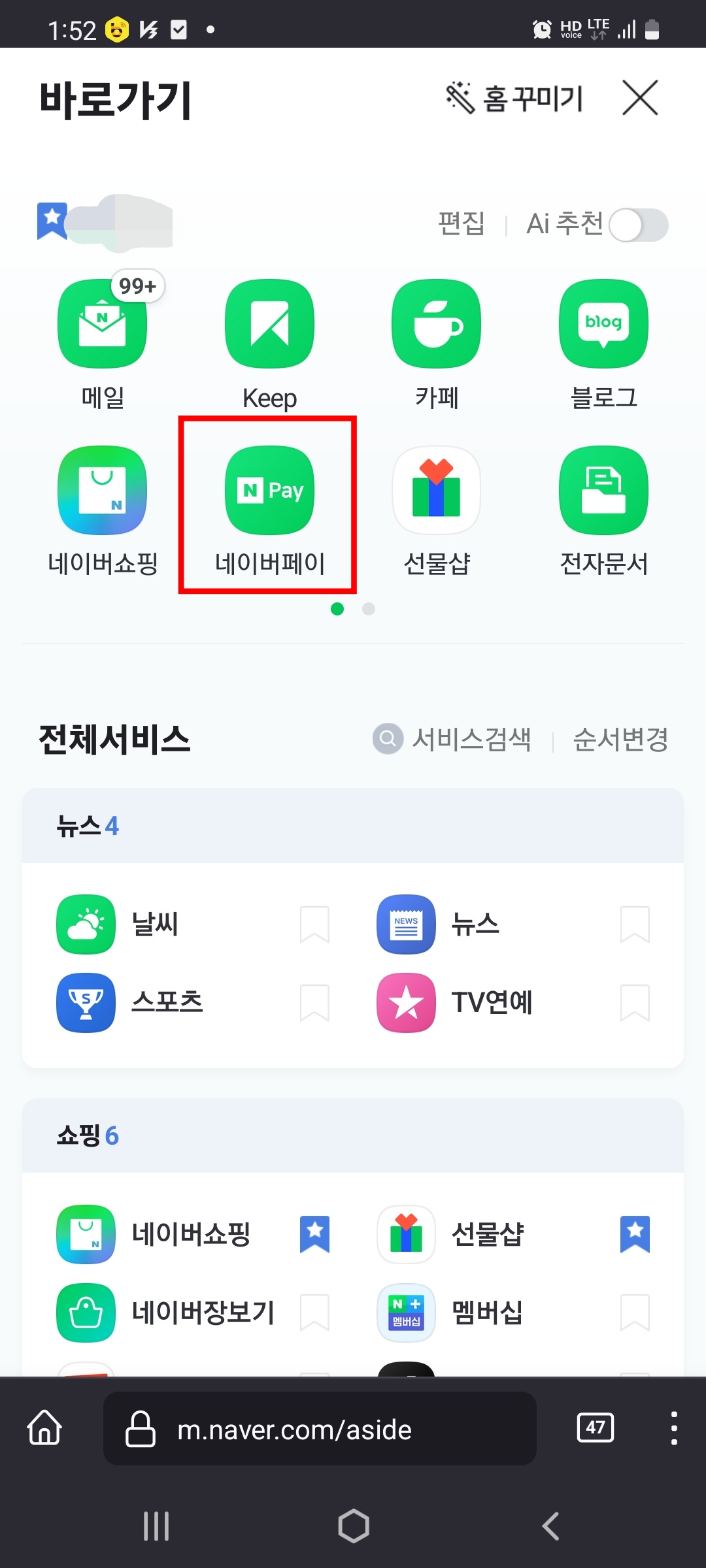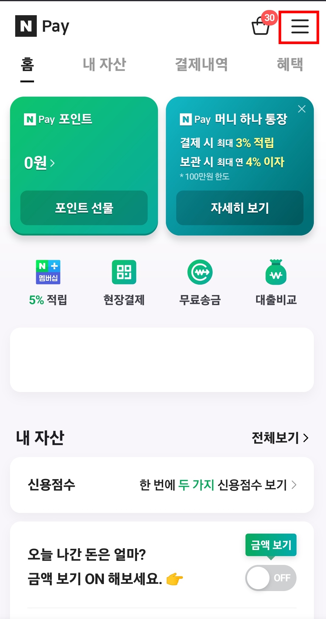 1. 네이버 메인화면에서 줄 세개를 찾아 클릭해주세요.