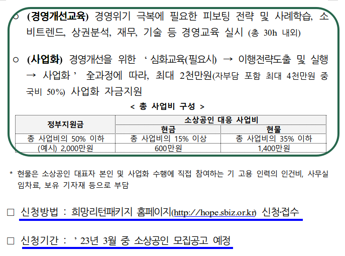 위기를 맞은 소상공인이 경영정상화를 할 수있도록 지원을 해서 폐업위기 극복을 도와주거나 신속 안전한 사업 정리 후 재창업을 하거나 임금근로자 전환을 통해 안정적 재기를 할수있도록 지원하는 프로그램입니다.