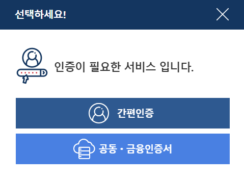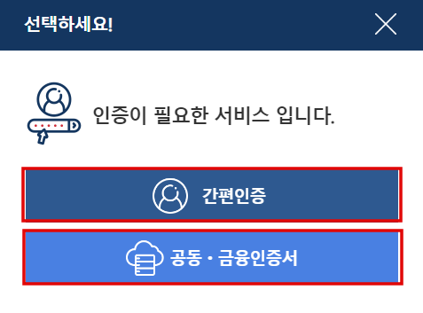 간편인증이 편하시면 간편인증 , 공동 금융인증서가 편하시면 공동 금융인증서 인증을 클릭하시면 됩니다.