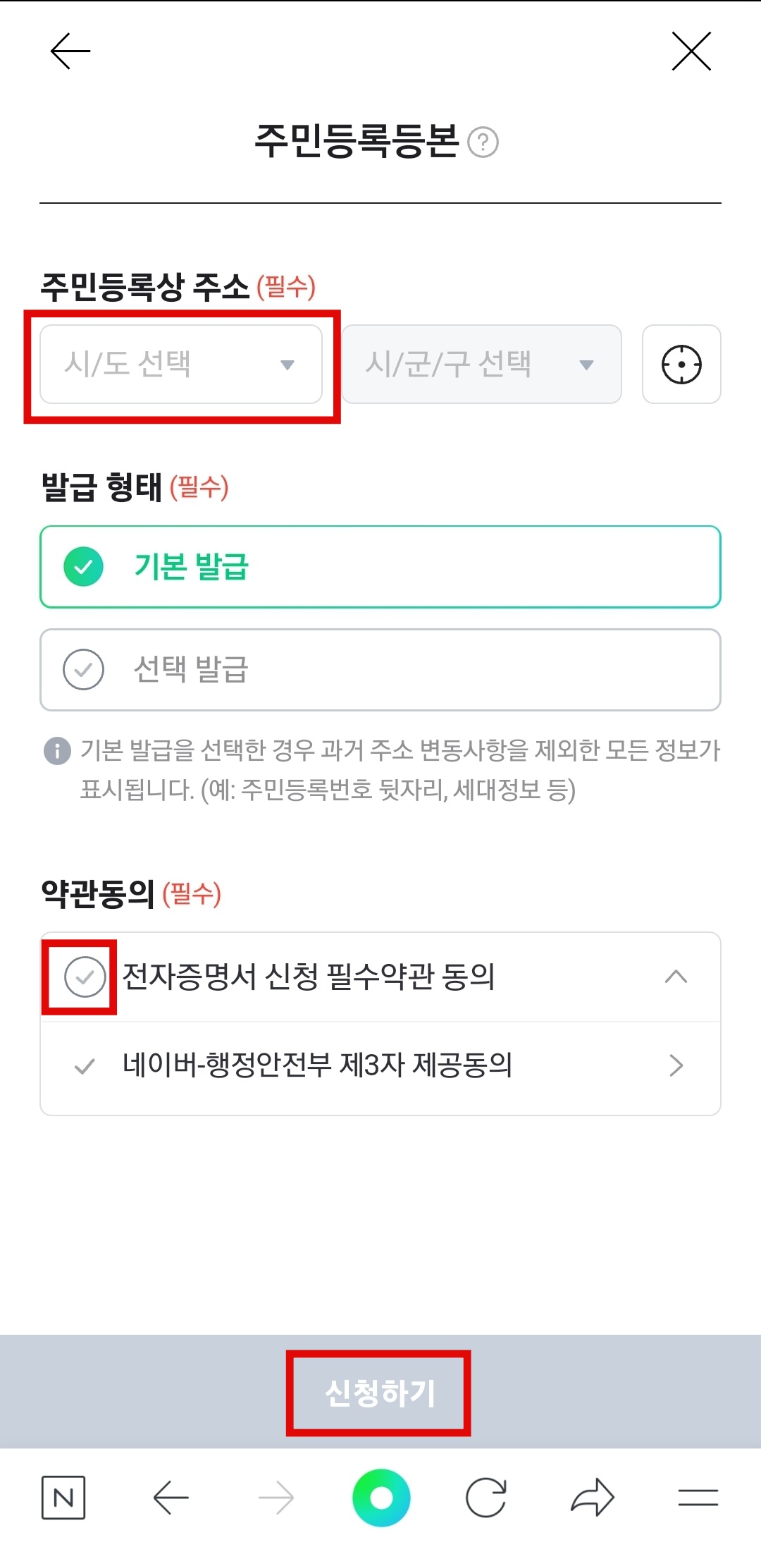 증명서에서 주민등록등본을 누르고 주민등록상 주소를 입력하고 약관동의를 한 후 신청하기를 눌러줍니다.