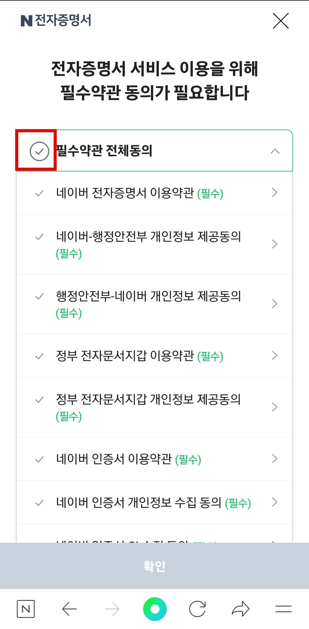 전자증명서 신청하기를 클릭하고 필수약관에 모두 동의를 해줘요