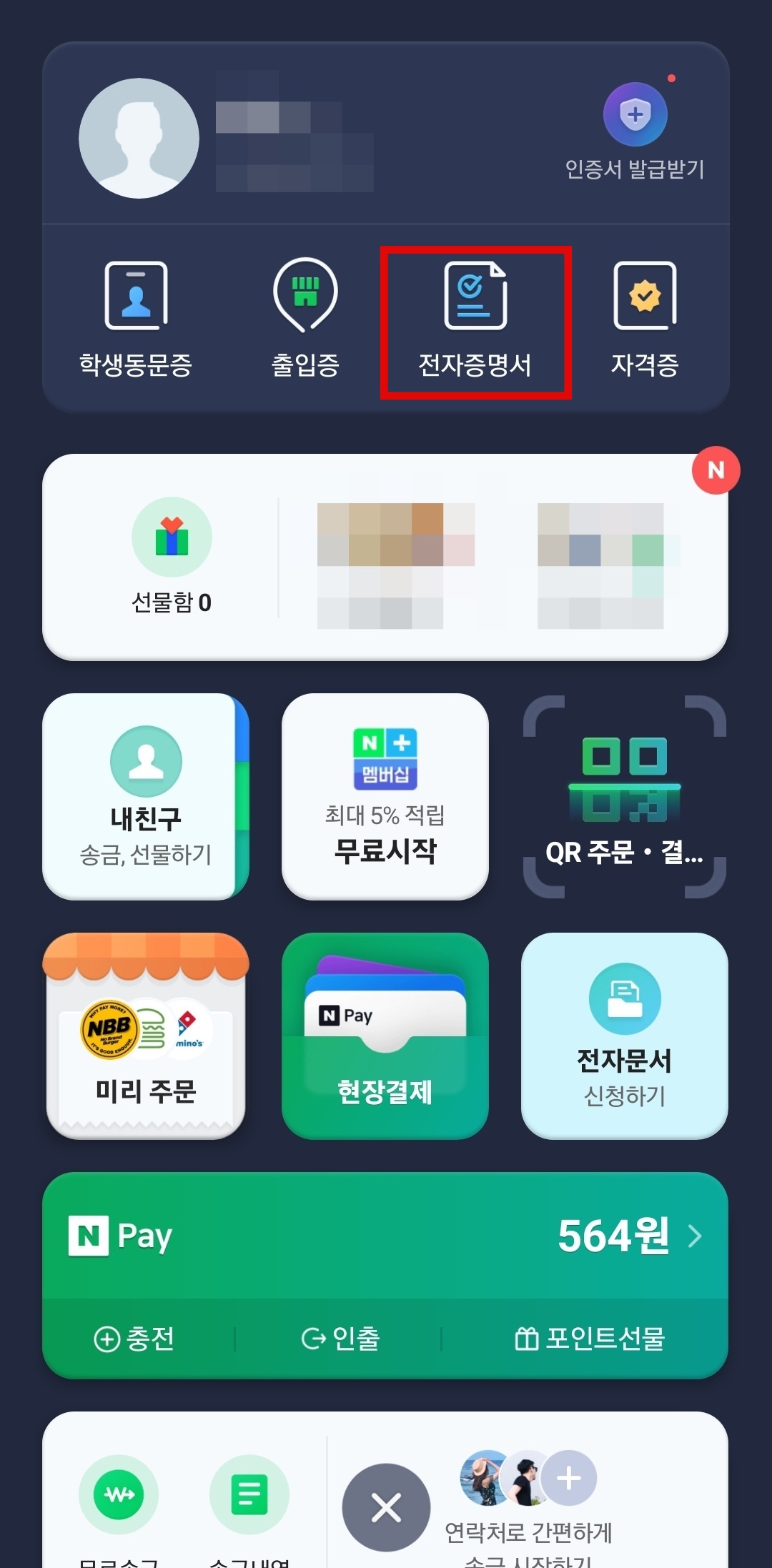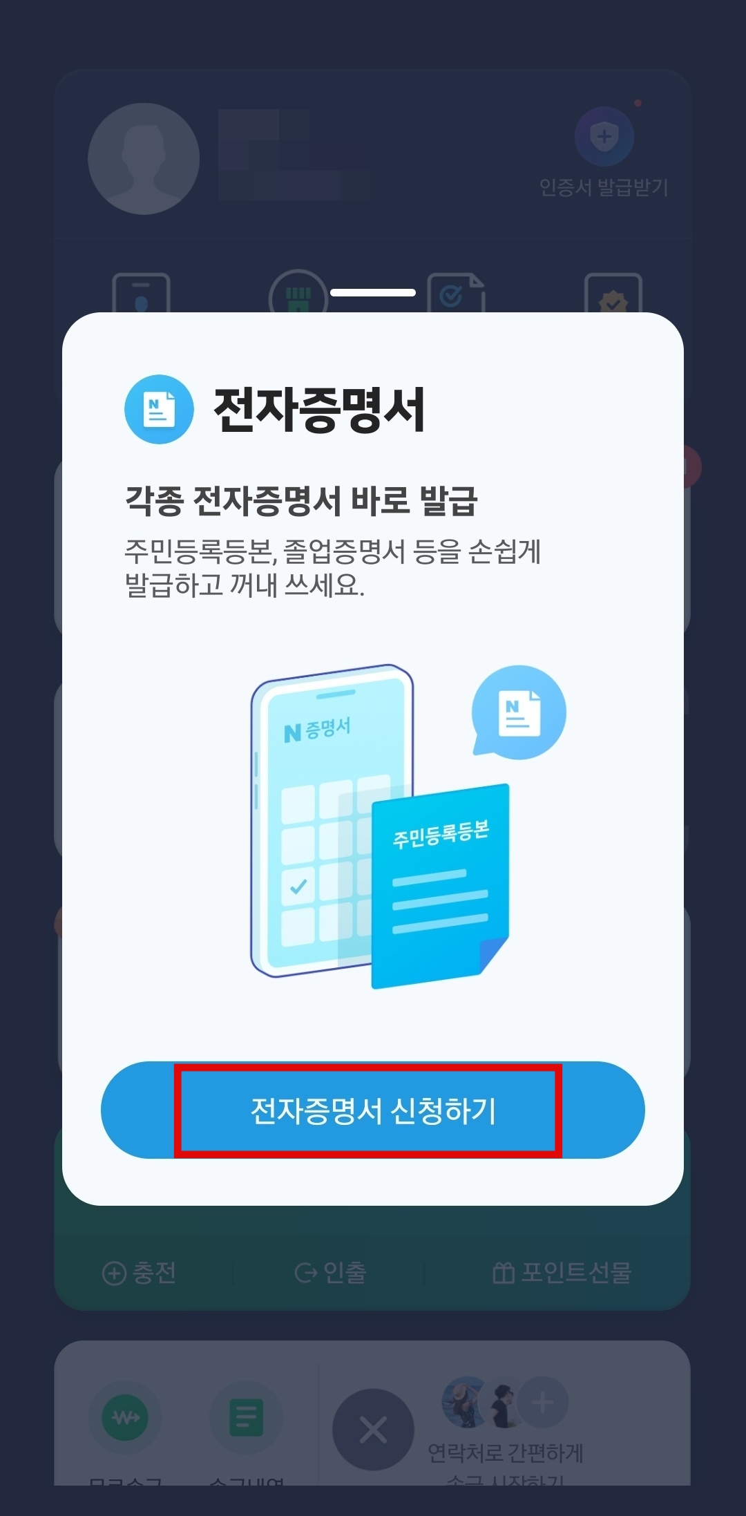 오른쪽 상단의 Na 버튼을 클릭한 후 전자증명서를 클릭합니다.