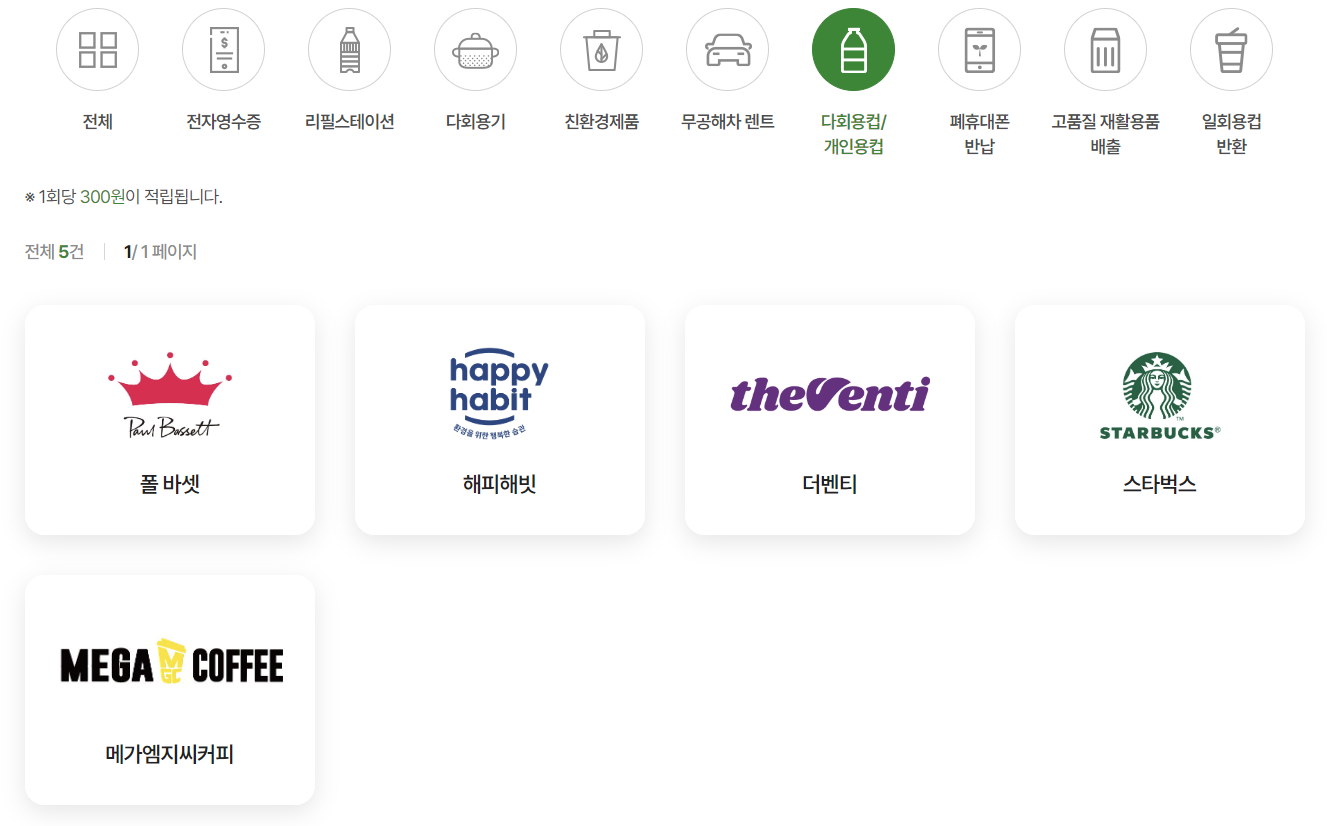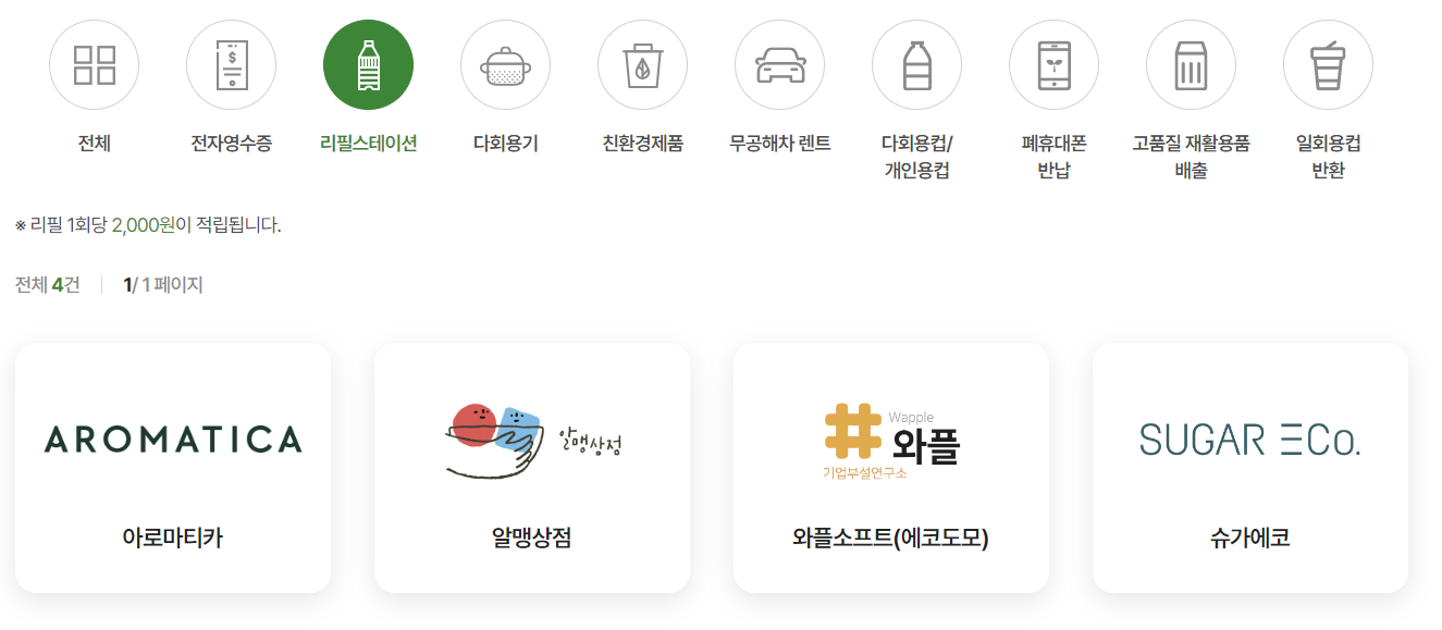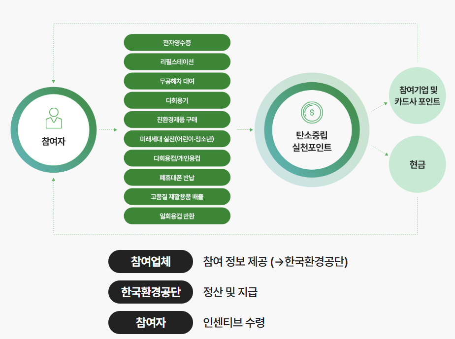 참여자가 전자영수증, 리필스테이션, 무공해차 대여, 다회용기,친환경제품 구매,미래세대실천(어린이,청소년), 다회용컵/개인용컵, 폐휴대폰 반남, 고품질 재활용품 배출, 일회용컵 반환등을 하면 참여업체에서 참여정보를 한국환경공단에 제공해서 참여자에게 인센티브를 제공하는 식입니다.