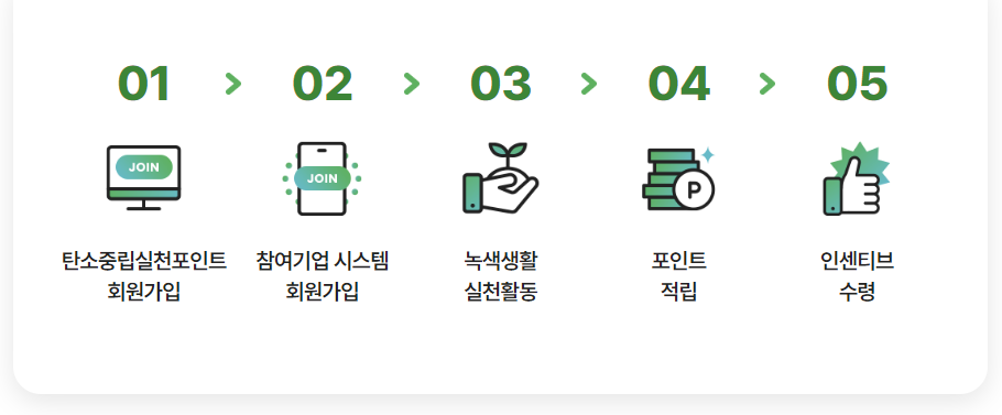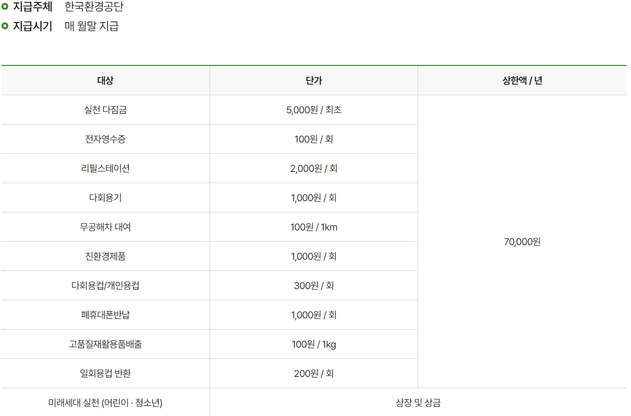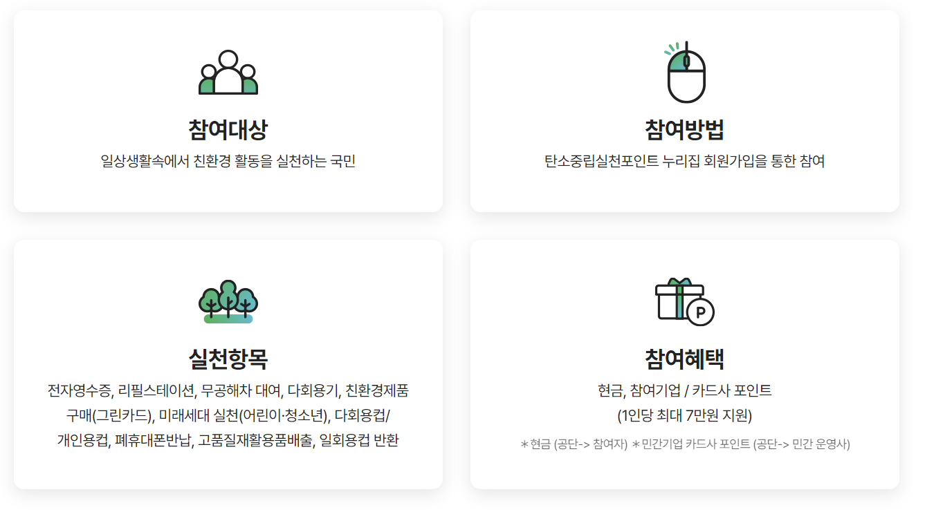 일반국민의 탄소중립 생활실천문화 확산을 위하여 다양한 민간기업의 친환경활동 이용 시 이용실적에 따라 인센티브를 지원하는 제도입니다.