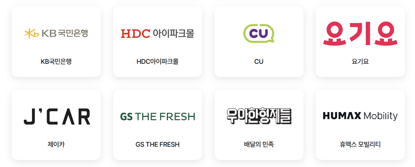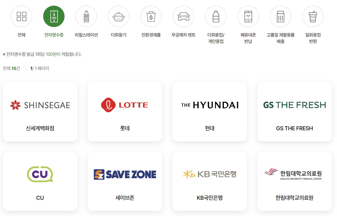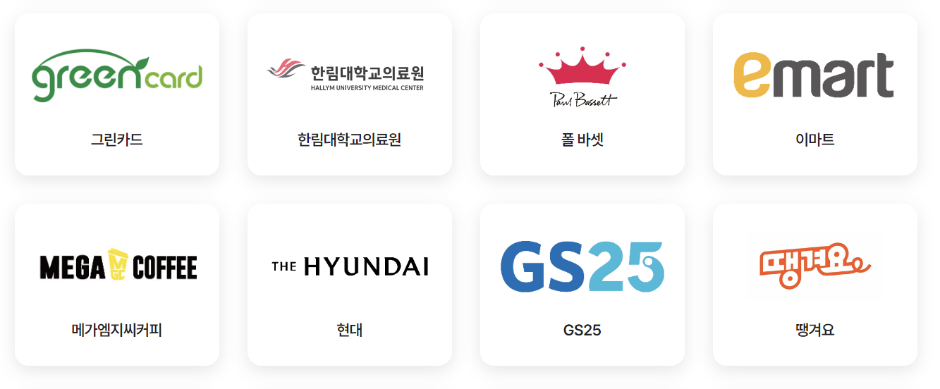 신세계백화점, 롯데, 현대, gs the fresh, cu, 세이브존, kb 국민은행, 한림대학교의료원, kt, 폴 바셋, 이마트,hdc아이파크몰이 있습니다. 1회당 100원이 적립됩니다.